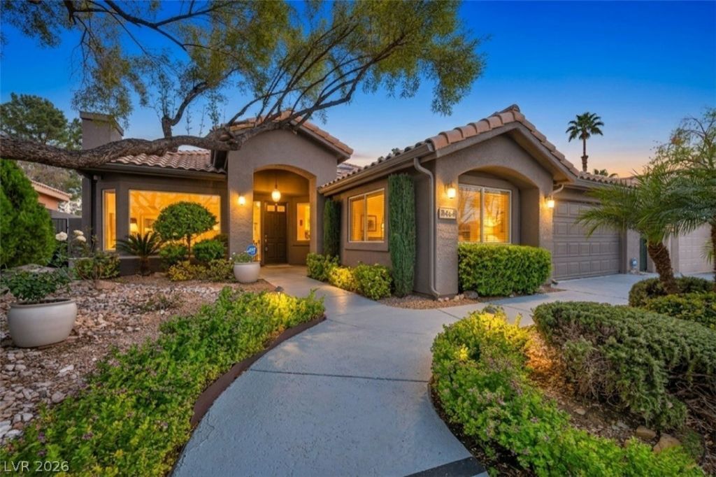 Experience refined single-story living in the guard-gated Canyon Gate Country Club, offering privacy, elegance, and resort-style amenities. This upgraded home features rich mahogany flooring, paid-off solar, and an EV charger. The spacious owner's suite includes a custom walk-in closet and spa-inspired bath with dual sinks, soaking tub, and separate shower. The kitchen showcases quartz countertops, thick square-edge surfaces, custom cabinetry, stainless steel appliances, dual ovens, and a breakfast bar. Formal living room with fireplace and a family room with built-ins. Third bedroom/office with coffered ceiling and built-in bookshelves.Plus * additional room **which could be used as a studio, also ideal for gym or office. Private backyard with covered patio and mature planters, perfect for relaxing or entertaining. Enjoy golf, pool, clubhouse dining, and 24-hour security, minutes from Summerlin shopping and dining. Bring your golf clubs!